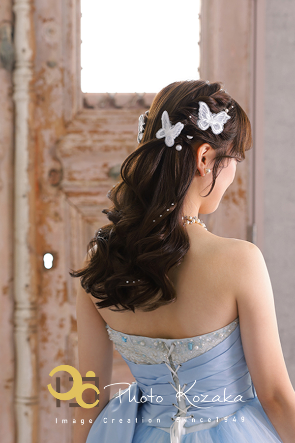 振袖では髪型をアップスタイルにされたこちらの成人さんは、ドレス撮影はふわふわのダウンスタイルに。